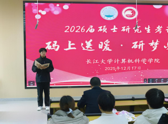 考研冲刺号角已吹响,为帮助学子坚定信念、严守考纪、从容应考,12月17日下午,计算机科学学院在东校区16教A110教室隆重举办“码上送暖,研梦必达”考研送温暖主题活动。此次活动由毕业生辅导员高滢主持,学院院长崔艳荣、党委副书记艾林、毕业生班主任、辅导员及全体考研学子共同参与,以干货分享、暖心激励与物资支持为考研路上的学子们注入强劲动力。